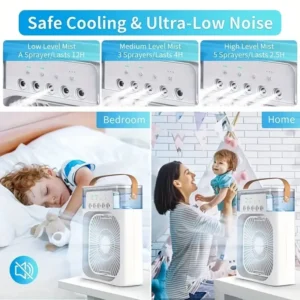 Enjoy a pleasant breeze with added humidity—this device combines a powerful fan, water spray, and cooling pads to lower room temperature efficiently. Compact and mobile, it’s ideal for your bedroom, office, or patio.